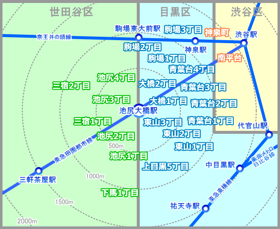 「池尻大橋駅」とその隣駅を中心にした検索、池尻大橋駅を中心にした1km以内の「丁目」からの検索もできます。 |